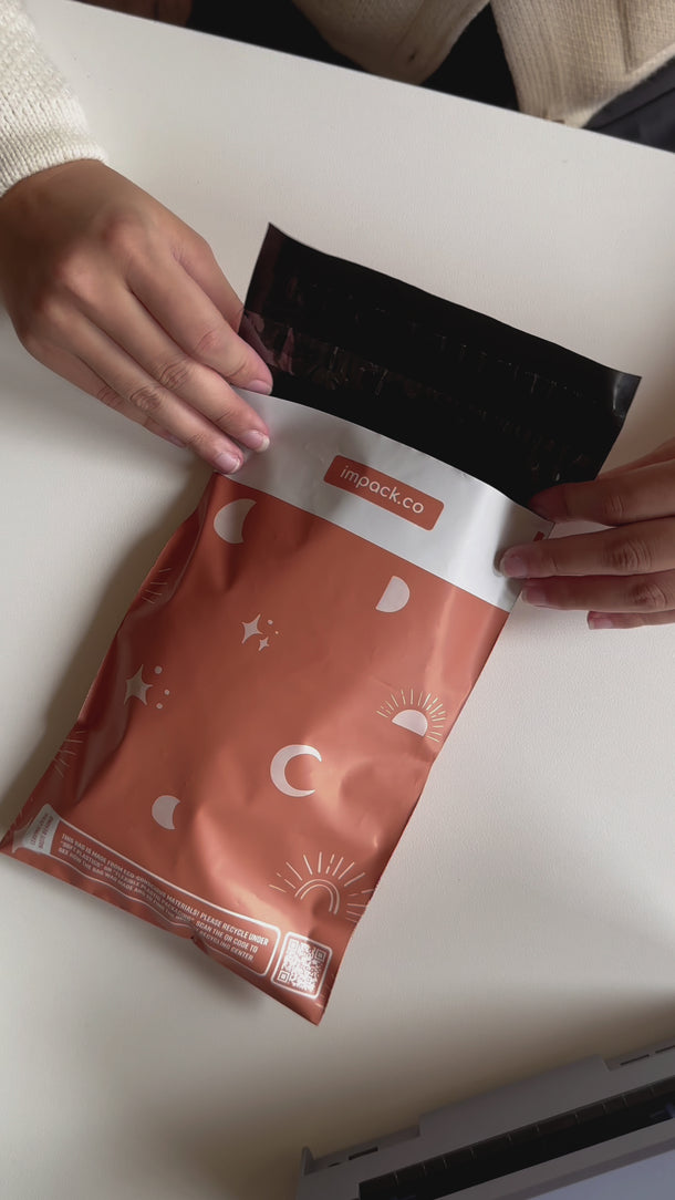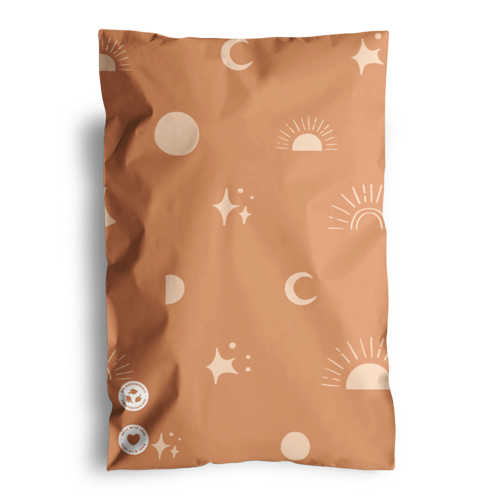 Design: Featuring a warm, darker tan base compared to the same print on our paper padded mailers, this Celestial Tan print also showcase the celestial motifs of moons and stars, giving your package an enchanting and whimsical touch.