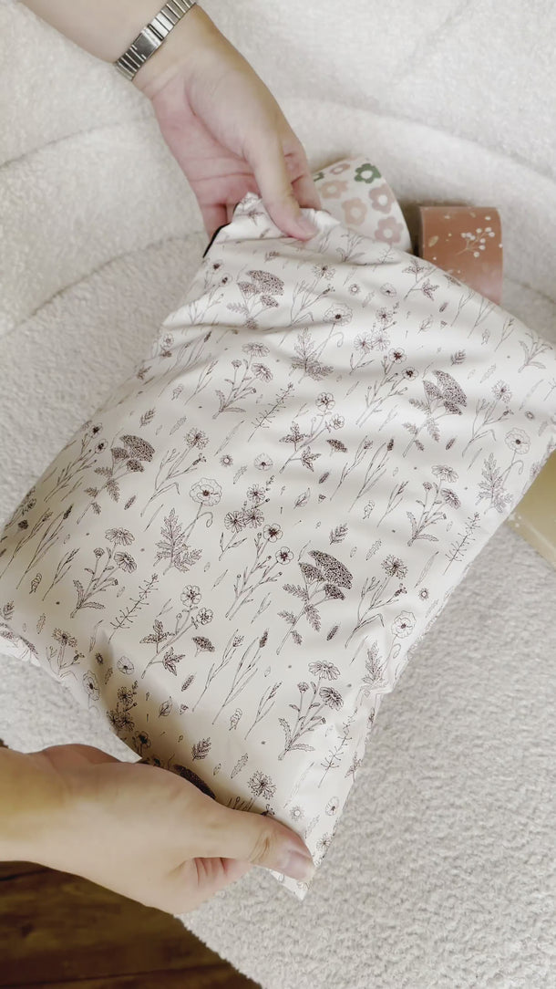 Design: The Wildflowers print brings a serene, meadow-like feel to your packaging with its delicate white floral illustrations against a warm beige backdrop. This design adds a touch of rustic charm and natural beauty, perfect for making your packages stand out.