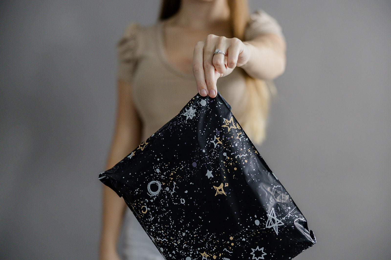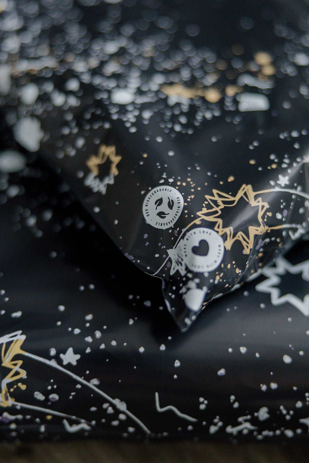 Design: Take a journey through the cosmos. The rich navy background and intricate white and gold star motifs capture the allure of the night sky. Delight your customers with a touch of celestial magic and make your deliveries truly unforgettable.